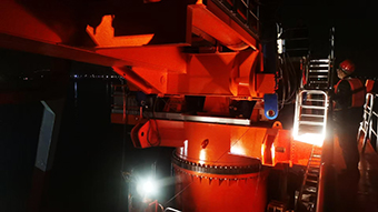 池州項(xiàng)目螺旋卸船機(jī)是國(guó)內(nèi)首臺(tái)安裝于躉船上的創(chuàng)新設(shè)備,此項(xiàng)目單臺(tái)卸船機(jī)裝卸效率可達(dá)800噸/小時(shí)。其設(shè)計(jì)需克服躉船橫搖縱搖對(duì)設(shè)備運(yùn)行穩(wěn)定性的影響,且因躉船空間限制,傳統(tǒng)機(jī)械檢修裝置無法上船。由于沒有任何先例經(jīng)驗(yàn)進(jìn)行參考,一切都要靠自己摸索,黨員突擊隊(duì)成立技術(shù)攻堅(jiān)小組,牽頭開展模擬實(shí)驗(yàn),創(chuàng)新性在螺旋卸船機(jī)各關(guān)鍵部位加裝定制化檢修平臺(tái)和裝置,既解決了設(shè)備維護(hù)難題,又能有效降低后期維修改造成本。